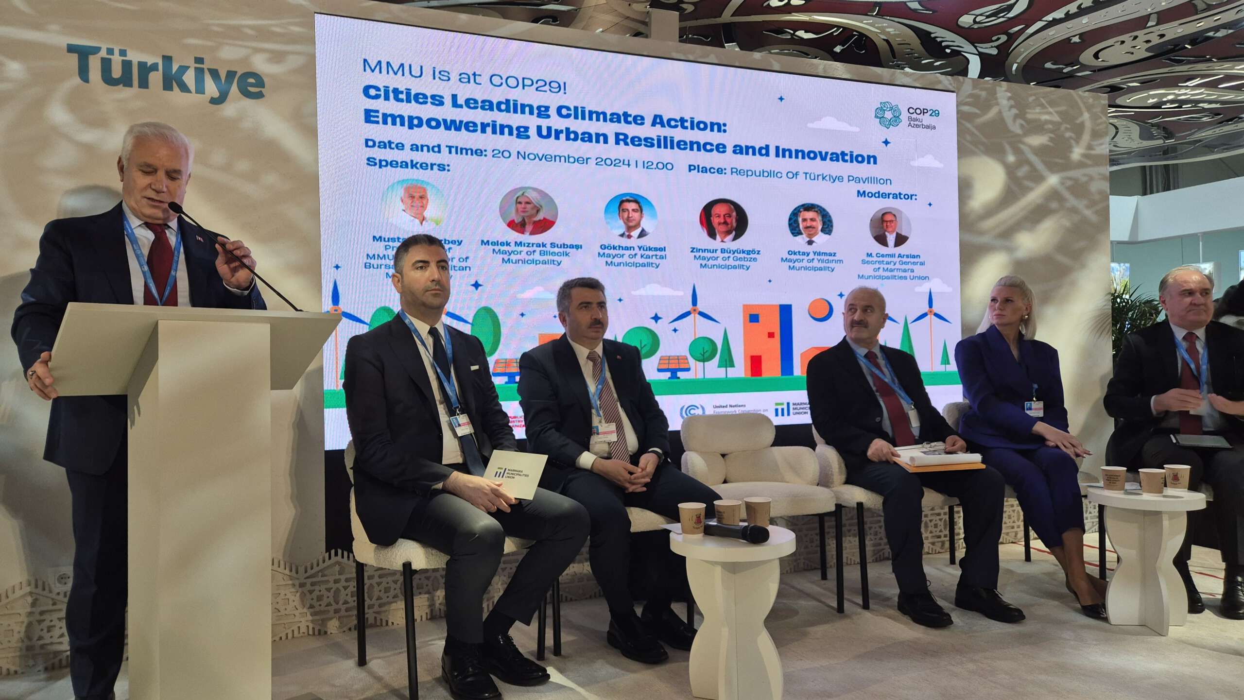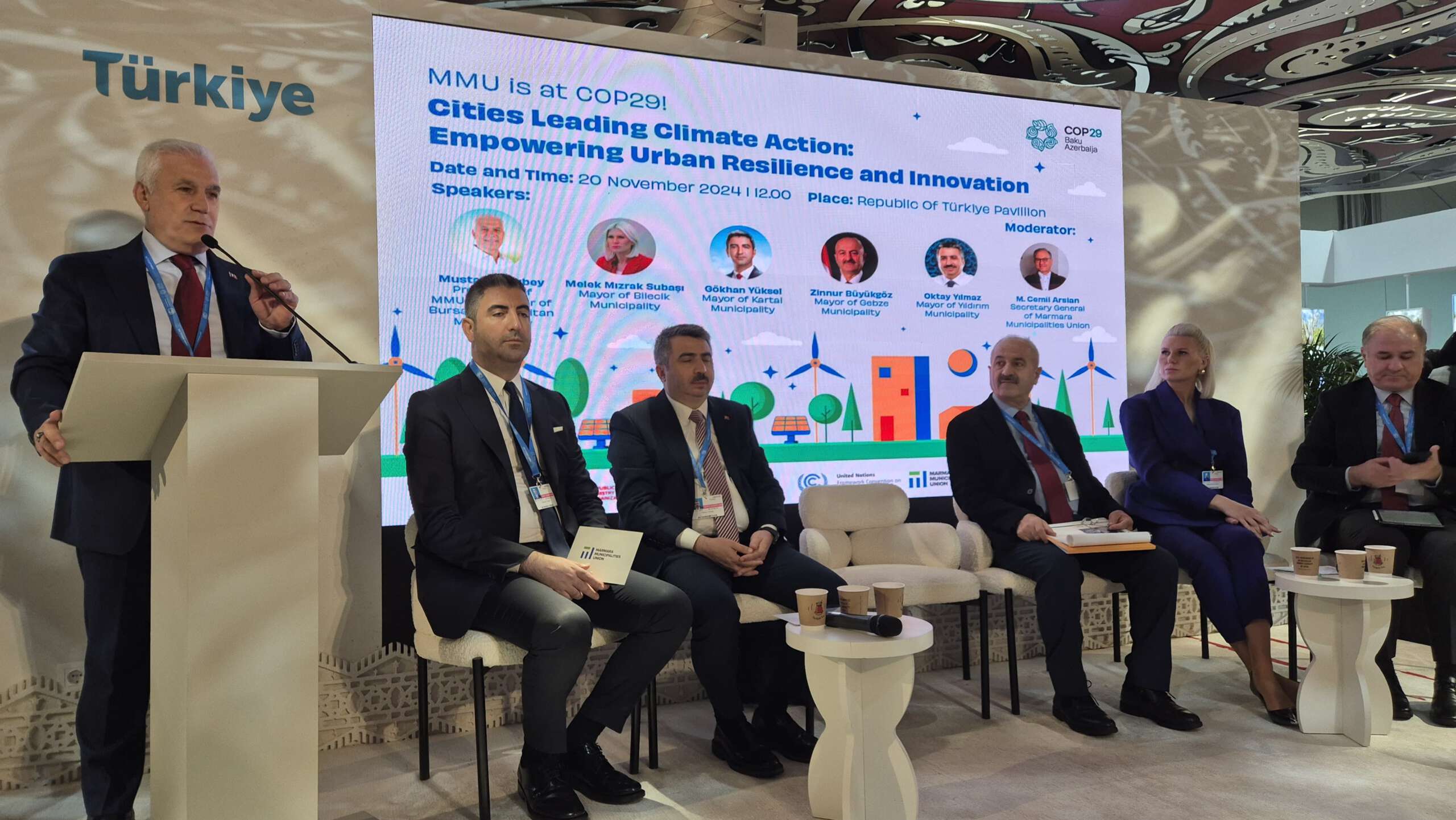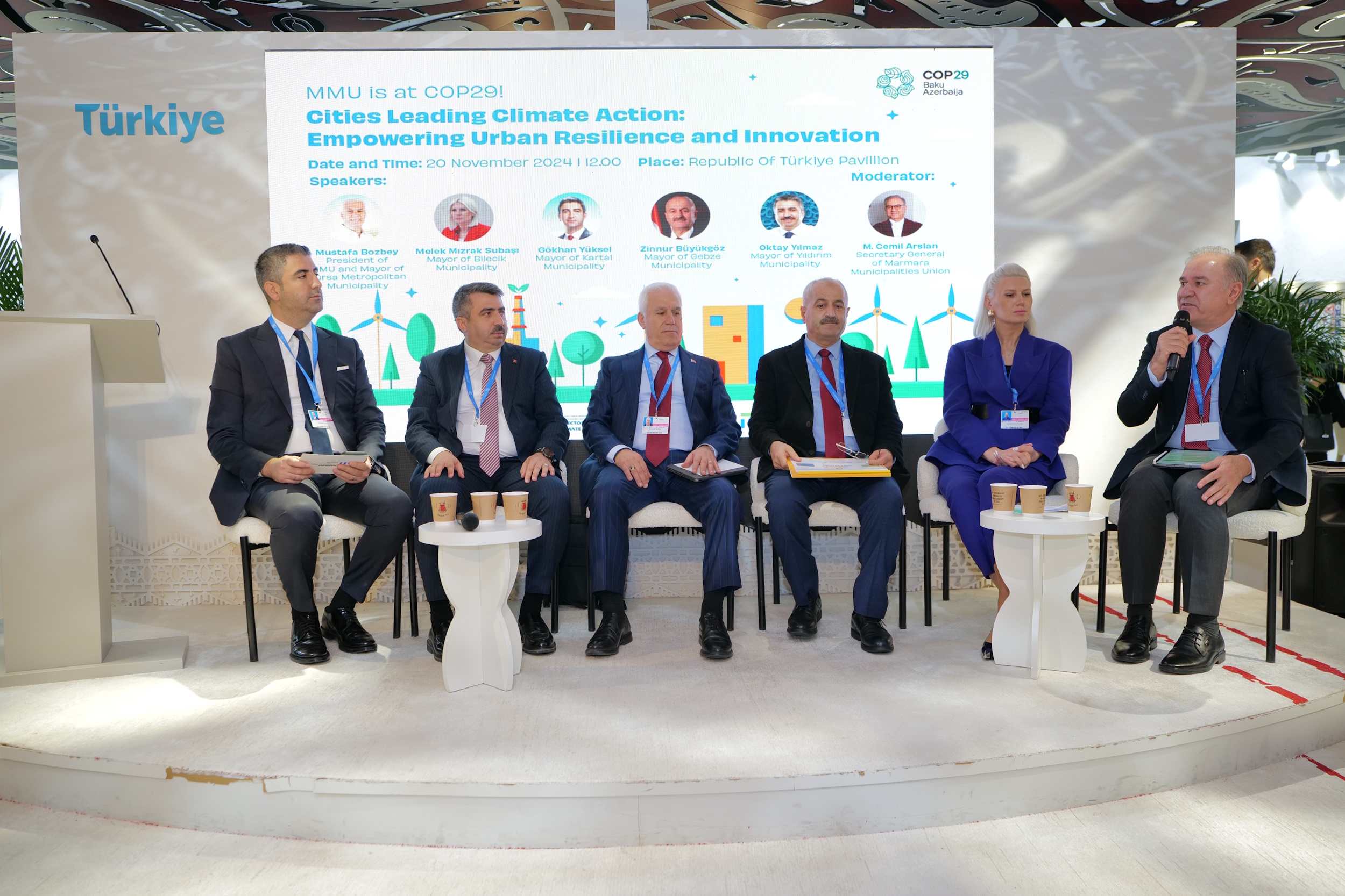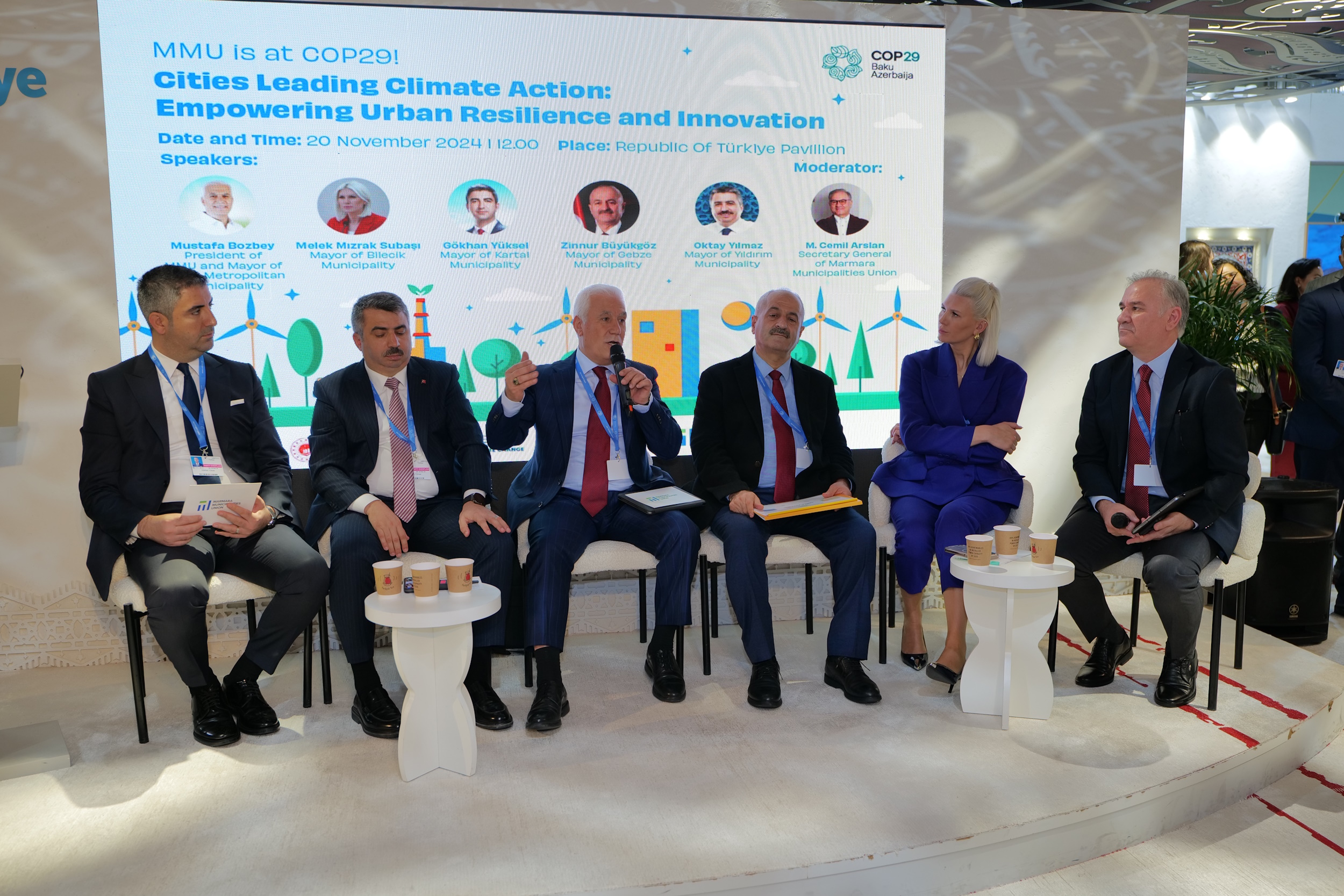 Marmara Belediyeler Birliği (MBB) ve Bursa Büyükşehir Belediye Başkanı Mustafa Bozbey, Azerbaycan’ın başkenti Bakü’de düzenlenen Birleşmiş Milletler (BM) İklim Değişikliği Konferansı (COP29) kapsamında gerçekleştirilen ‘İklim Değişikliğine Önderlik Eden Şehirler’ başlıklı toplantıya katıldı.