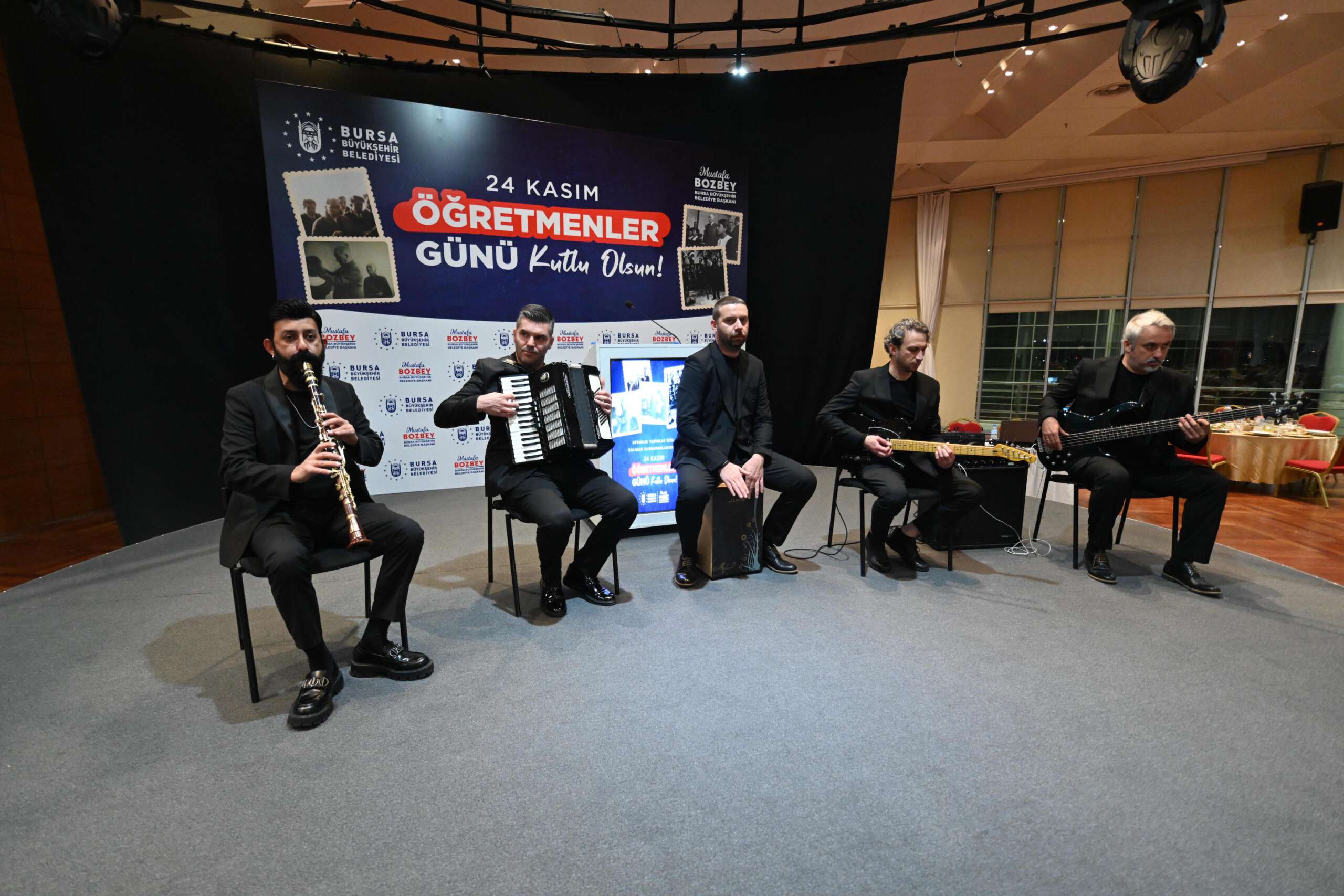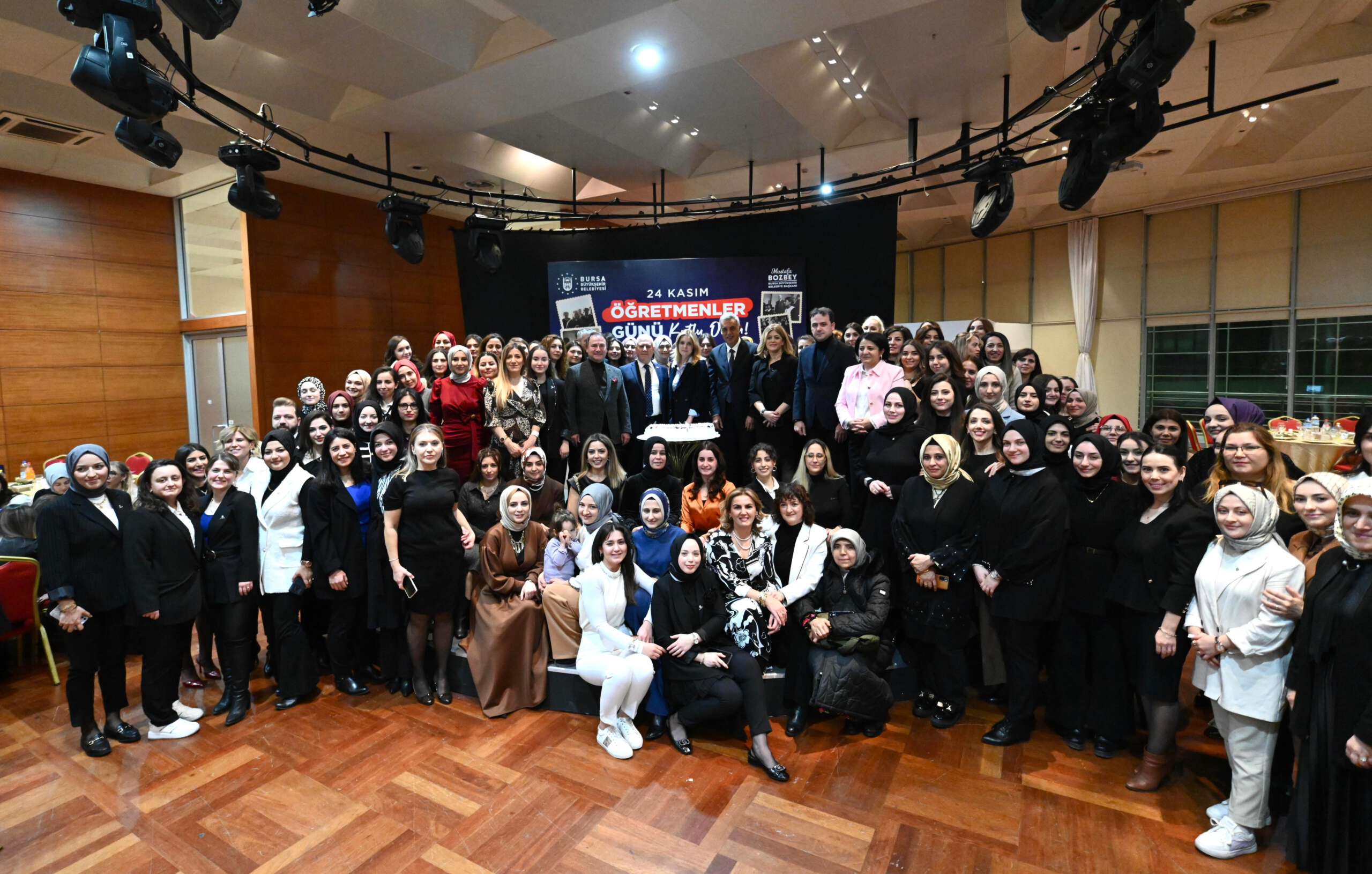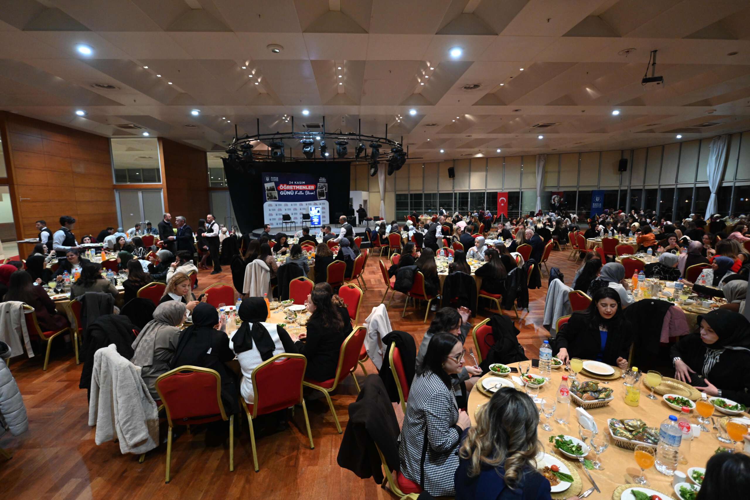 Bursa Büyükşehir Belediyesi bünyesindeki Bursa Yuvam, BUSMEK ve YKS kurslarında görevli öğretmenler, Merinos Atatürk Kongre ve Kültür Merkezi’ndeki 24 Kasım Öğretmenler Günü yemeğinde buluştu. Bursa Büyükşehir Belediye Başkanı Mustafa Bozbey ve eşi Seden Bozbey’in yanı sıra Büyükşehir Belediyesi Genel Sekreter Yardımcıları Ali Altunsoy, Mehmet Emin Direkçi ve Mehmet Yıldız, Dış İlişkiler Dairesi Başkanı Pınar Işıkyıldız ve BURFAŞ Yönetim Kurulu Başkanı Yalçın Işıkyıldız da bu özel günde öğretmenleri yalnız bırakmadı. Orkestra Şube Müdürlüğü sanatçılarının mini bir konser verdiği gecede, öğretmenler keyifli bir gün geçirdi.