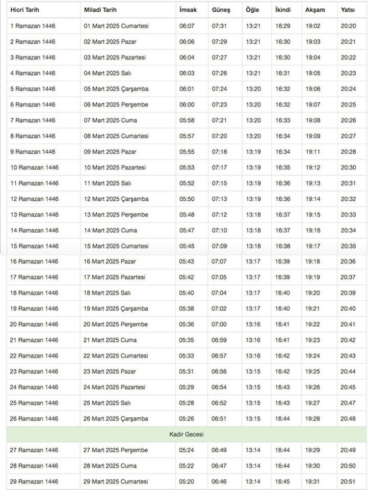 Diyanet, Ramazan imsakiyesini yayımladı.