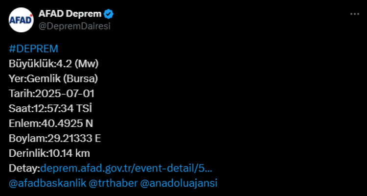 Afet ve Acil Durum Yönetimi Başkanlığı (AFAD) , saat 12.57’de Gemlik‘te 4.2 büyüklüğünde yeni bir sarsıntının kaydedildiğini duyurdu.