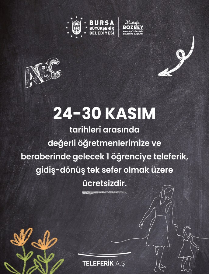 “Öğretmenlerimize güzel bir haberimiz daha var! Başöğretmenimiz Gazi Mustafa Kemal Atatürk başta olmak üzere, eğitimli nesiller ve aydınlık yarınlar için emek harcayan tüm öğretmenlerimizin 24 Kasım Öğretmenler Günü’nü kutluyor, 24-30 Kasım tarihleri arasında, değerli öğretmenlerimize ve beraberlerinde gelecek birer öğrenciye, teleferik ile Uludağ yolculuğu hediye ediyoruz. İyi ki varsınız! Unutmayın; Geçerlilik tarihi: 24 – 30 Kasım 2025”