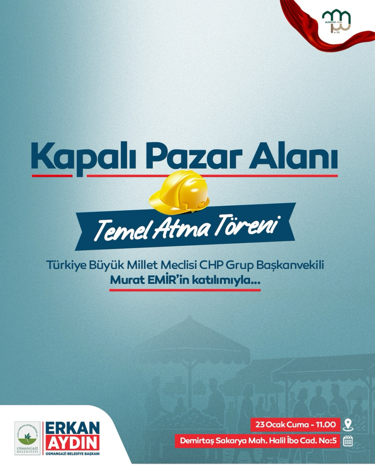Osmangazi Belediye Başkanı Erkan Aydın, Demirtaş Sakarya Mahallesi’nde hayata geçirilecek Kapalı Pazar Alanı projesinin temel atma töreninin 23 Ocak Cuma günü saat 11.00’de gerçekleştirileceğini duyurdu.