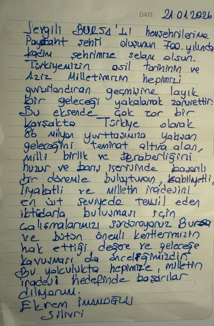 İmamoğlu mesajında, “Sevgili Bursalı hemşehrilerime, payitaht şehri olmasının 700. yılında kadim şehrimize selam olsun” ifadeleriyle başladığı mektubunda, Türkiye’nin asil tarihine ve milletin gurur duyulan geçmişine layık bir geleceği birlikte inşa etmenin zorunluluk olduğuna vurgu yaptı.