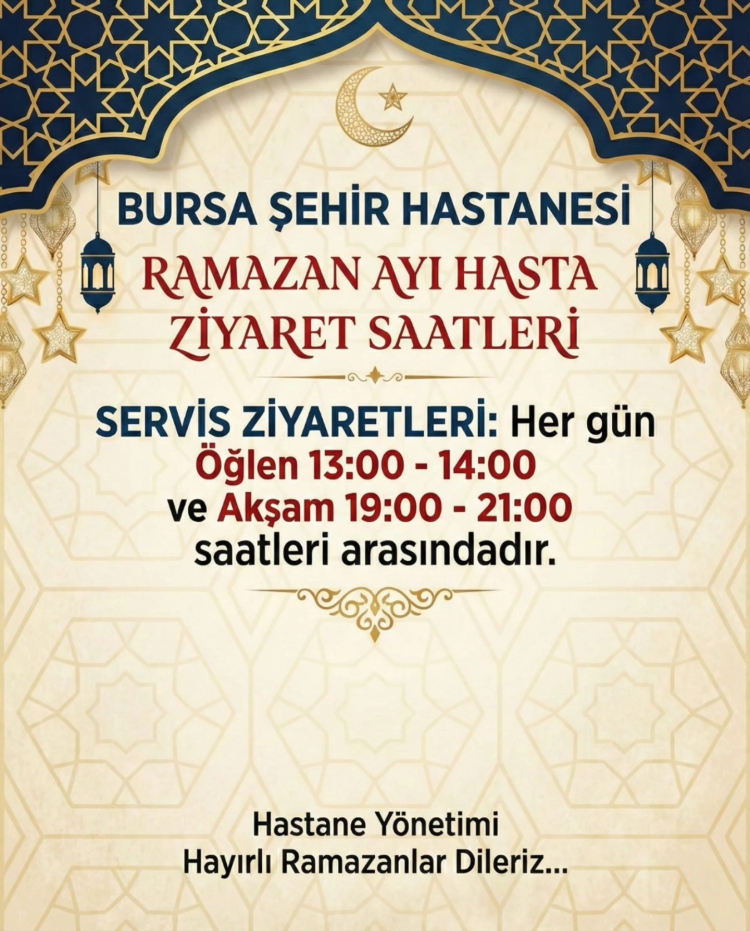 Bursa Şehir Hastanesi yönetimi, Ramazan ayı dolayısıyla hasta ziyaret saatlerinde uygulanacak düzenlemeyi ve hastane içinde teravih namazı kılınacağını duyurdu.