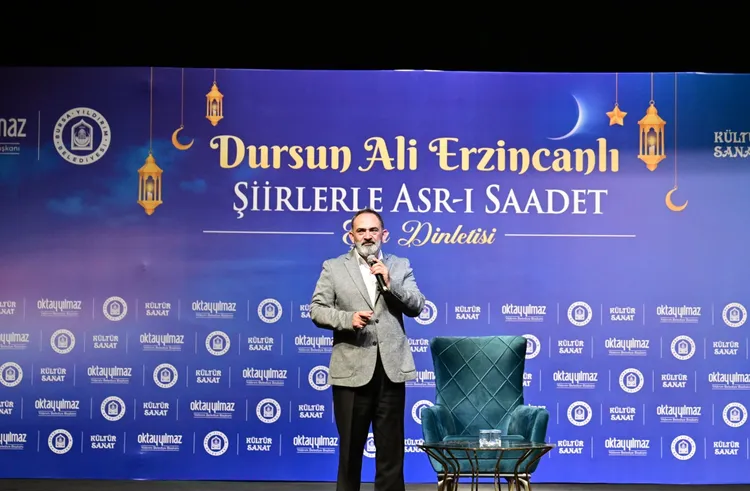 Yıldırım Belediyesi, Ramazan etkinlikleri kapsamında Şair Dursun Ali Erzincanlı’yı Bursalılarla buluşturdu. Barış Manço Kültür Merkezi’nde düzenlenen ‘Şiirlerle Asr-ı Sadet’ şiir dinletisine, ev sahibi Yıldırım Belediye Başkanı Oktay Yılmaz’ın yanı sıra AK Parti Yıldırım İlçe Başkanı İrfan Akkaya ve vatandaşlar katıldı. Bursalıların yoğun ilgi gösterdiği programda, Peygamber Efendimize (S.A.V.) atfedilen naat-ı şerifleri seslendirmesiyle tanınan Dursun Ali Erzincanlı birbirinden çok sevilen şiirlerini seslendirdi. Şiirleri ve sohbeti ile katılımcılara duygu dolu anlar yaşatan Erzincanlı, Ramazan ayının ruhunu, iklimini yaşatan etkinlikler düzenleyen Yıldırım Belediyesi ve Başkan Oktay Yılmaz’a teşekkür etti.